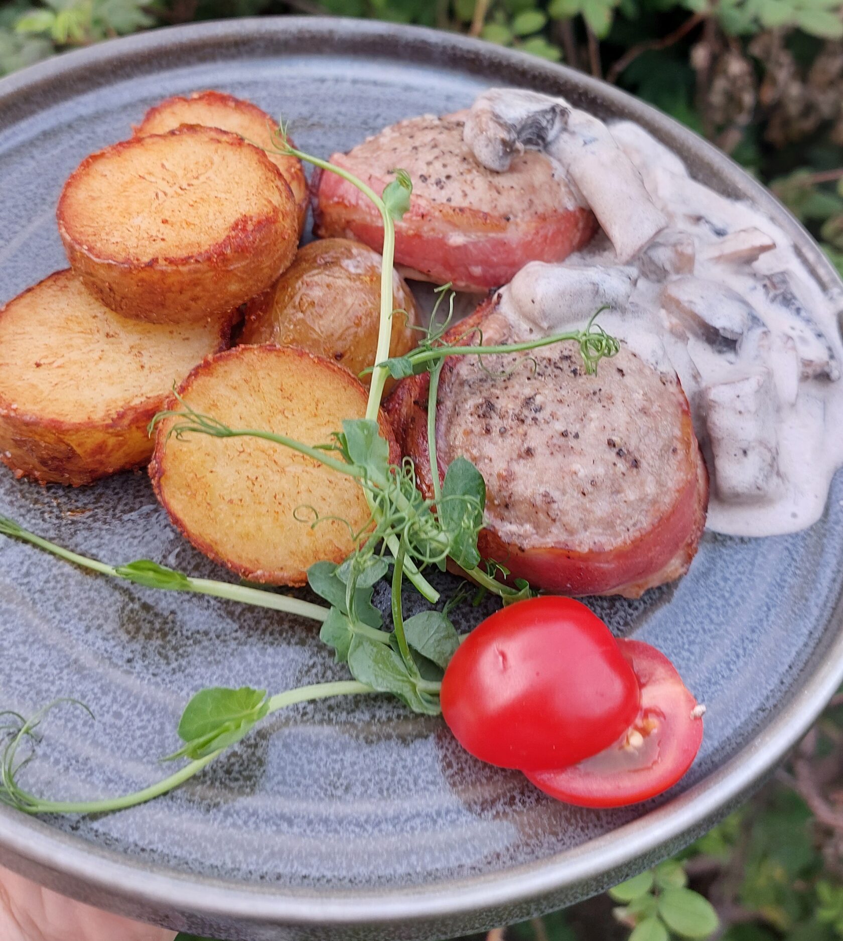 Медальоны из свинины в беконе с соусом из лесных грибов