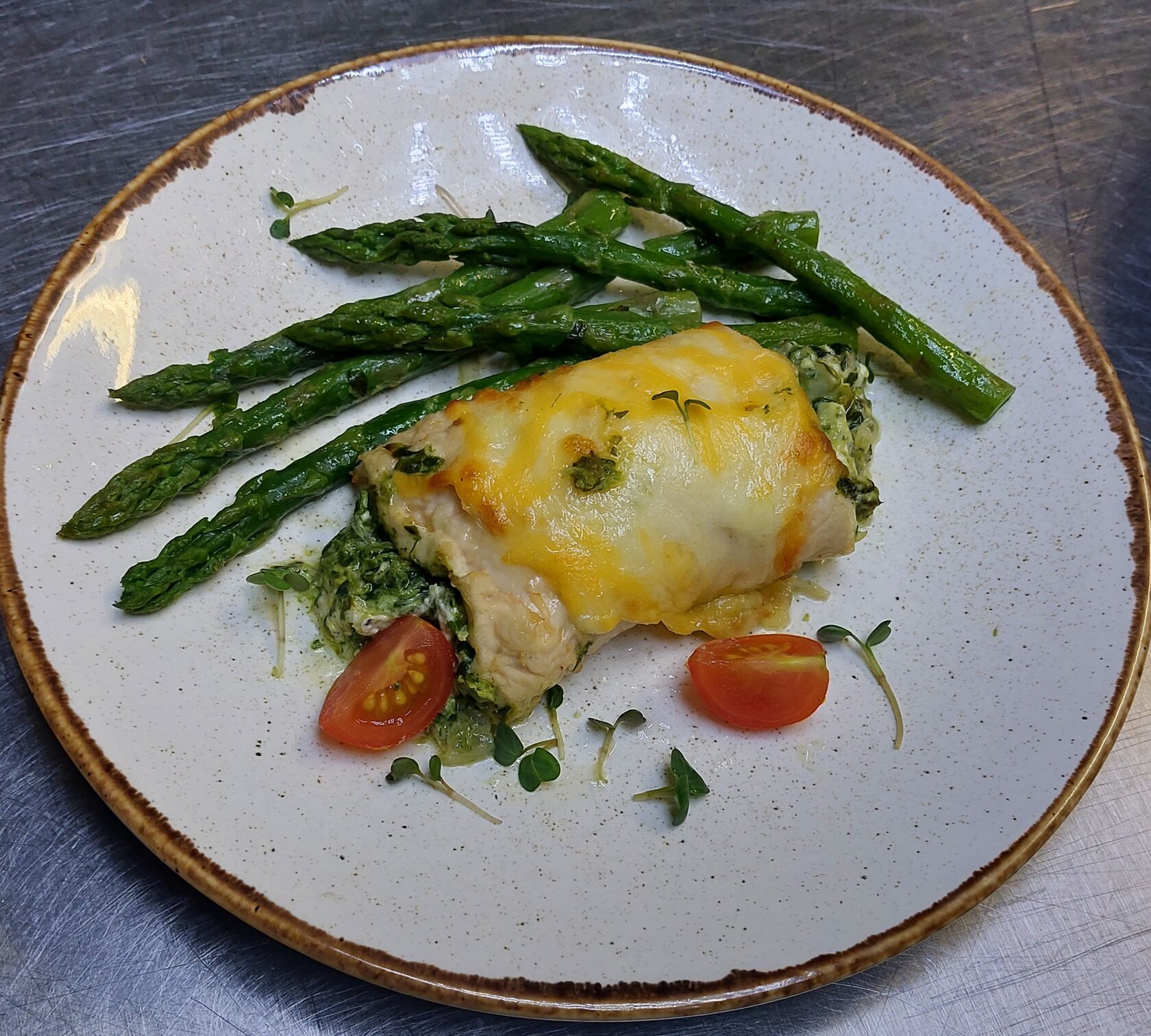 Грудка куриная, начиненная сыром сливочным со шпинатом с добавлением сыров с плесенью. Запеченная под сыром Моцарелла. Гарнир заказывается отдельно