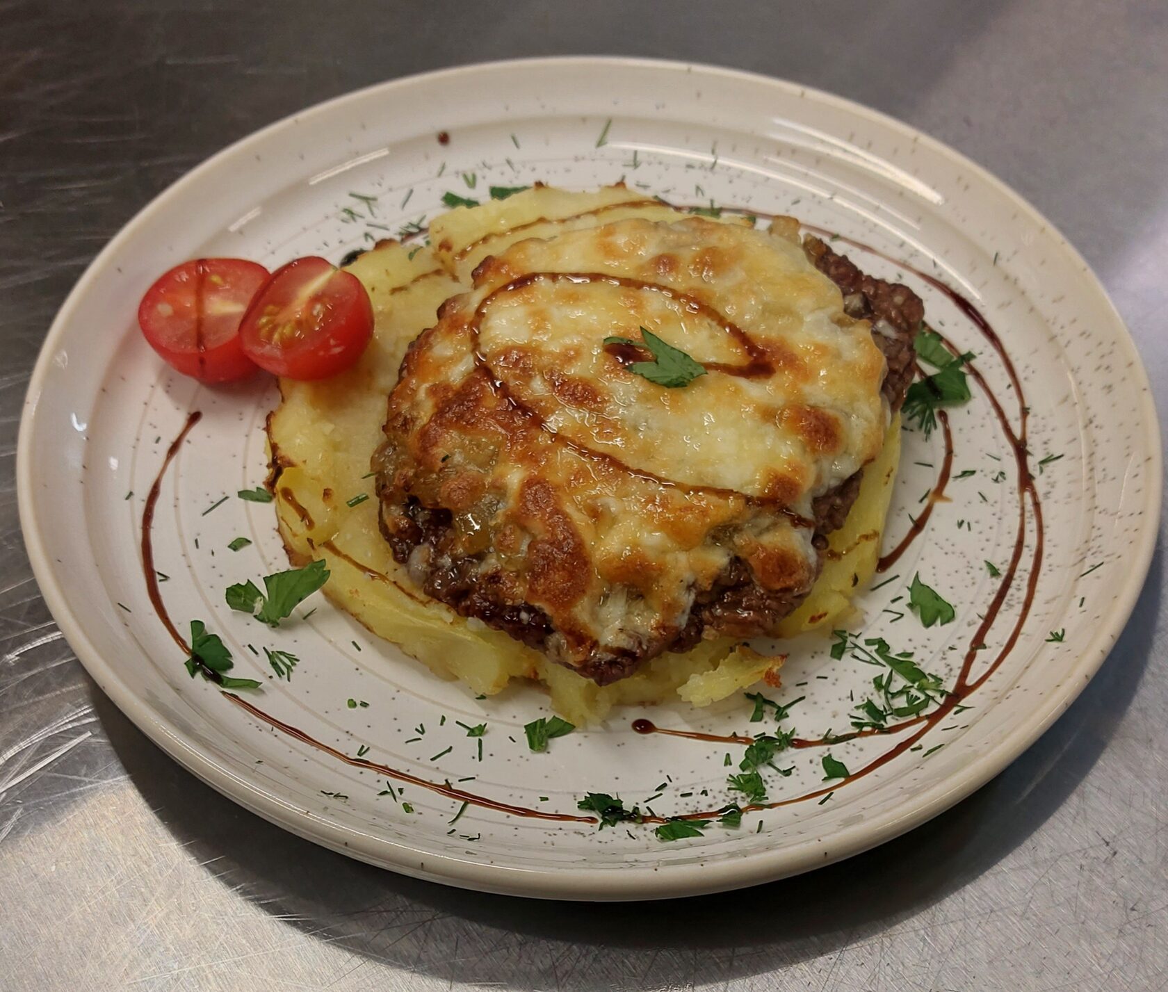 Свинина, запеченная с картофелем , томатами и сыром