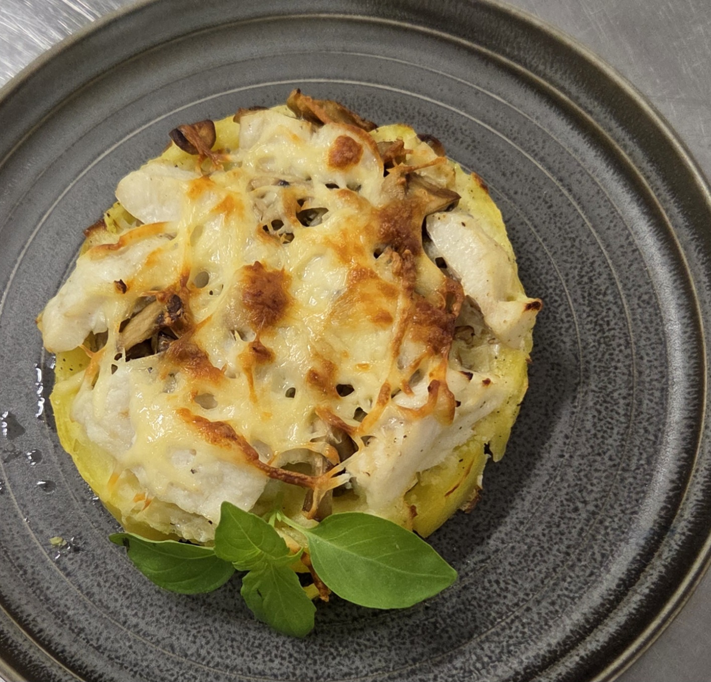 Филе трески, запеченное с картофелем, грибами и сыром