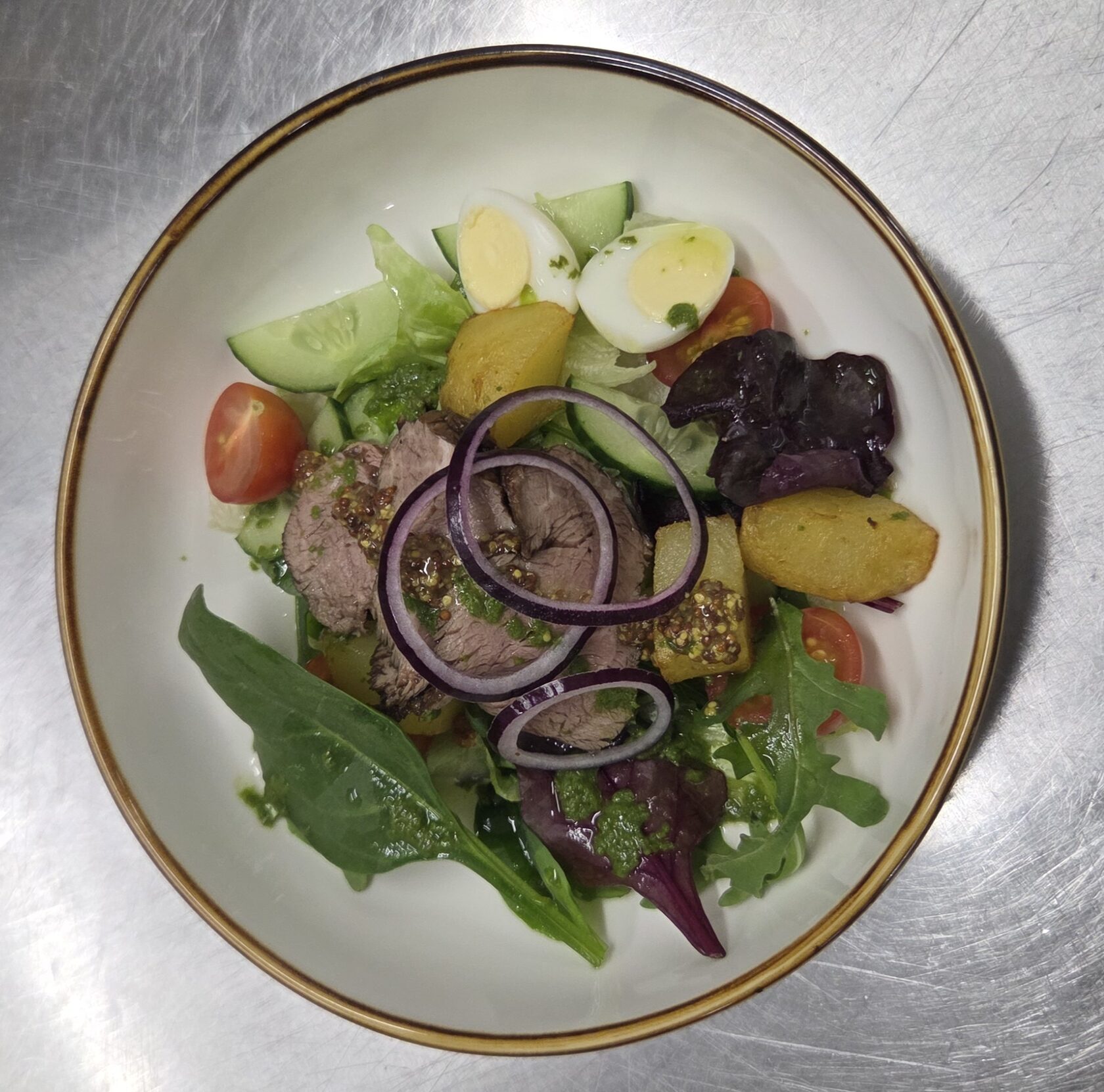 Картофельное пюре и бефстроганов из говяжьей вырезки с грибами, подгарнировка из маринованного огурца и лука фри